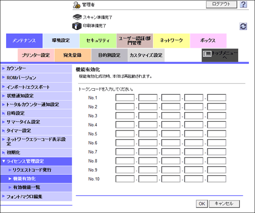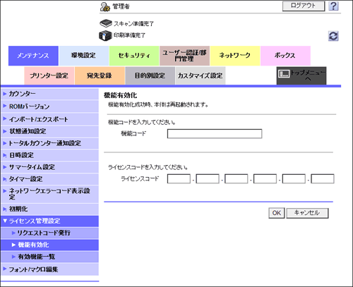 管理者モードの[メンテナンス]-[ライセンス管理設定]-[機能有効化]で、機能コードとライセンスコードを入力し、[OK]をクリックします。