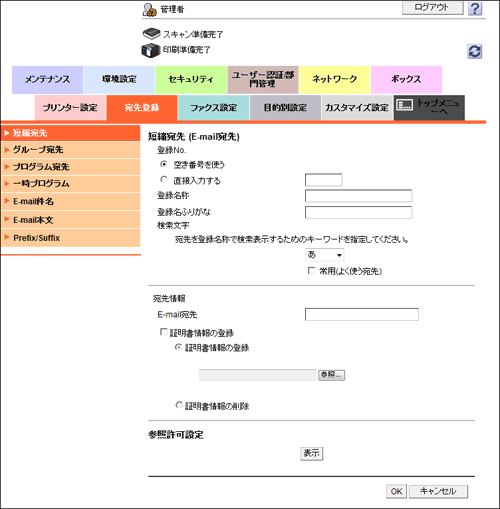 管理者モードの[宛先登録]-[短縮宛先]-[新規登録]-[E-mail宛先]-[OK]をクリックし、次の設定をします。