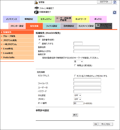 管理者モードの[宛先登録]-[短縮宛先]-[新規登録]-[WebDAV宛先]-[OK]をクリックし、次の設定をします。
