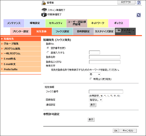 管理者モードの[宛先登録]-[短縮宛先]-[新規登録]-[ファクス宛先]-[OK]をクリックし、次の設定をします。