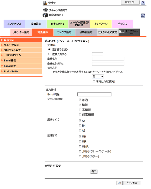 管理者モードの[宛先登録]-[短縮宛先]-[新規登録]-[インターネットファクス宛先]-[OK]をクリックし、次の設定をします。