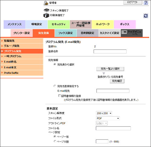 管理者モードの[宛先登録]-[プログラム宛先]- [登録]- [E-mail宛先]-[OK]をクリックし、次の設定をします。
