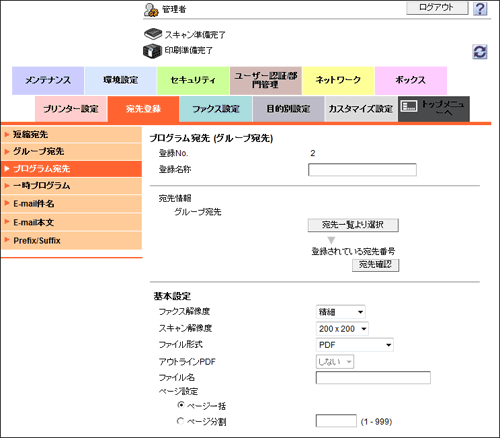 管理者モードの[宛先登録]-[プログラム宛先]-[登録]-[グループ宛先]-[OK]をクリックし、次の設定をします。