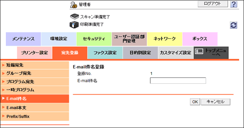 管理者モードの[宛先登録]-[E-mail件名]-[編集]で、[E-mail件名]に登録する件名を入力します(・を除く半角64文字/全角32文字以内)。