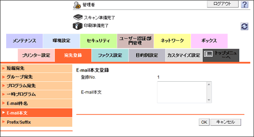 管理者モードの[宛先登録]-[E-mail本文]-[編集]で、[E-mail本文]に登録する本文を入力します(・を除く半角256文字/全角128文字以内)。
