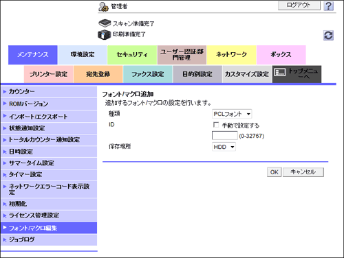フォントやマクロを本機に追加します。また、登録したフォントやマクロを削除します。