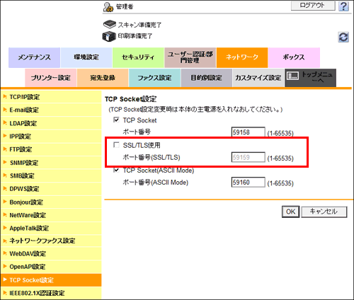 管理者モードの[ネットワーク]-[TCP Socket設定]で、次の設定をします。