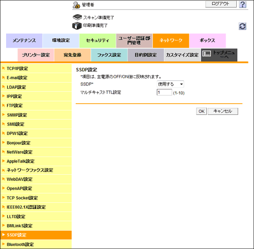管理者モードの[ネットワーク]-[SSDP設定]で、次の設定をします。