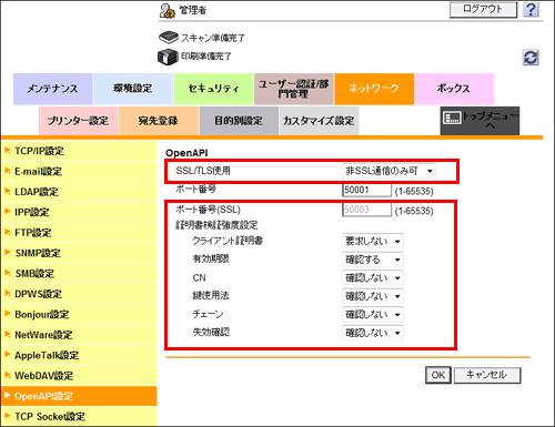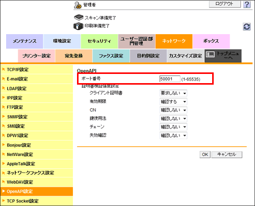 管理者モードの[ネットワーク]-[OpenAPI設定]で、必要に応じて、ポート番号を変更します(初期値:[50001])。