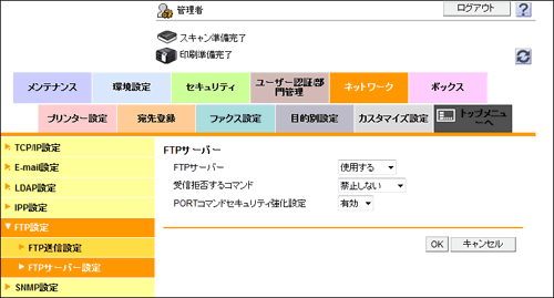 管理者モードの[ネットワーク]-[FTP設定]-[FTPサーバー設定]で、次の設定をします。