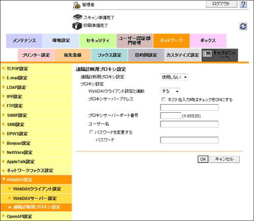管理者モードの[ネットワーク]-[WebDAV設定]-[遠隔診断用プロキシ設定]で、次の設定をします。