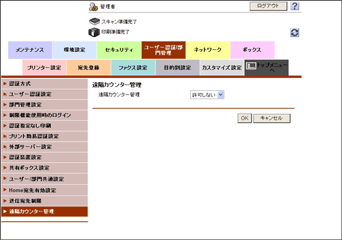 管理者モードの[ユーザー認証/部門管理]-[遠隔カウンター管理]で[遠隔カウンター管理]を[許可する]に設定します(初期値:[許可しない])。