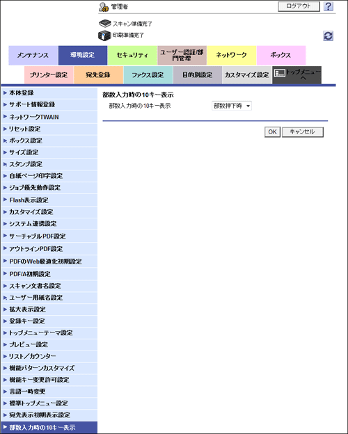 管理者モードの[環境設定]-[部数入力時の10キー表示]で、[常時]または[部数押下時]を設定します(初期値:[部数押下時])。
