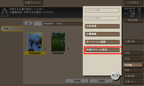 本機のUSBポートにUSBメモリーを装着した状態で、ファイルを選んでから[その他]-[外部メモリーに保存]をタップすると、ファイルをUSBメモリーに保存できます。