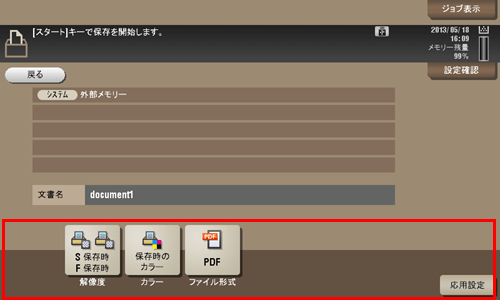 ファイルを選んでから[文書コピー]をタップすると、ファイルを他のボックスへコピーできます。コピー先のボックスは共有/個人/グループボックスから選べます。コピー先のボックスを選び、[実行]をタップするか、またはスタートを押します。
