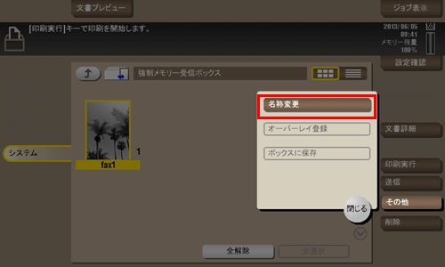 ファイルを選んでから[その他]-[名称変更]をタップすると、ファイルの名前を変更できます。タッチパネルから新しい名前を入力します。