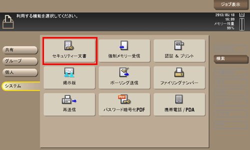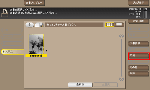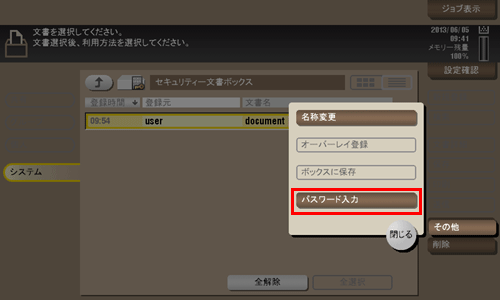 [認証操作禁止機能]が[モード2]に設定されている場合、セキュリティ文書ボックス内のファイルを選ぶときにもパスワードの入力が必要です。同じ文書ID を設定したセキュリティ文書も1 ファイルごとにパスワードの入力が必要です。したがって初期設定の[モード1]よりもセキュリティレベルが高くなります。[認証操作禁止機能]について詳しくは、こちらをごらんください。