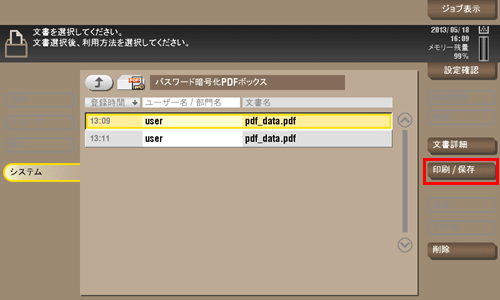 パスワード暗号化PDFボックスに保存されたファイルは、あらかじめ印刷、保存の処理方法が設定されています。処理の方法を印刷から保存、保存から印刷に変更はできません。