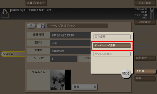 登録したオーバーレイ画像は、コピーモードの[応用設定]-[登録オーバーレイ]を設定することで、原稿に合成してコピーできます。また、ボックスからファイルを印刷するときに、[応用設定]-[登録オーバーレイ]を設定することで、ファイルに合成して印刷できます。