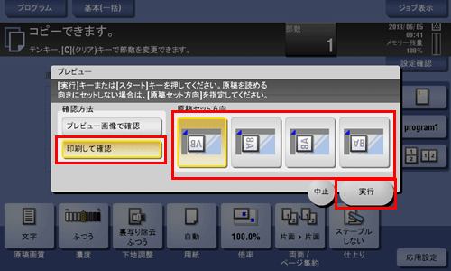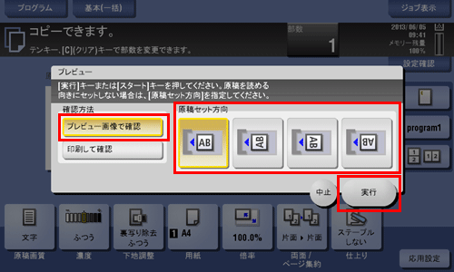 スタートを押す前に[プレビュー]をタップすると、仕上り状態をタッチパネル上で確認できます。仕上りを確認する方法については、こちらをごらんください。
