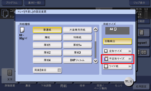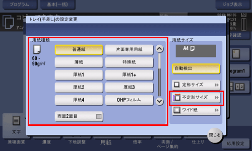 A1. 手差しトレイに不定形サイズの用紙をセットし、コピーモードの用紙画面で手差しトレイを指定すれば、コピーできます。