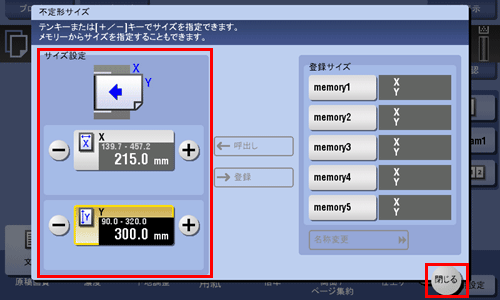 [サイズ設定]で[X]方向、[Y]方向の用紙サイズを入力し、[閉じる]をタップします。