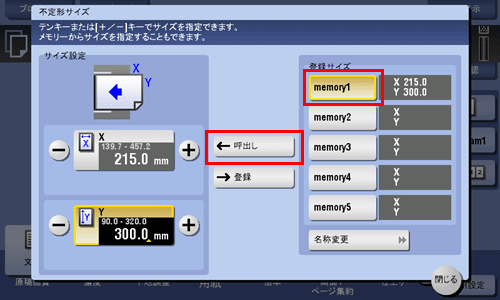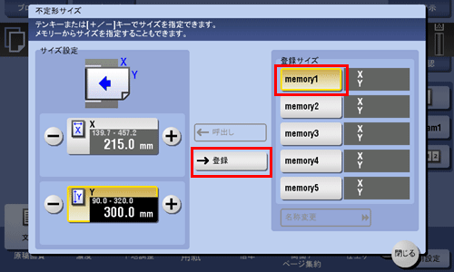 よく使う不定形サイズの用紙は、メモリーに登録しておくと便利です。