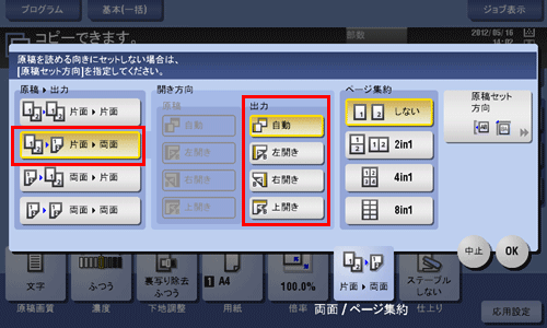 [原稿>出力]から[片面>両面]を選び、[出力]からコピーの開き方向を選びます。