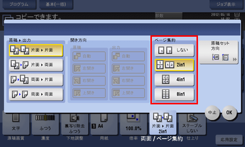 [ページ集約]から1枚の用紙の同じ面にコピーするページ数を選びます。