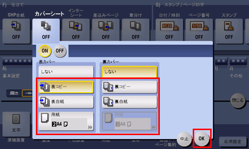 [カバーシート] | 表カバーや裏カバーの付いた原稿をコピーする場合、表カバーや裏カバーだけを別の用紙にコピーできます。また、表カバーや裏カバーのない原稿をコピーする場合、表カバーや裏カバーとして白紙の用紙を挿入できます。 |