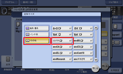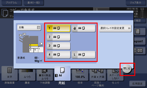[用紙]をタップし、カードをコピーする用紙の給紙トレイを選んで、[閉じる]をタップします。