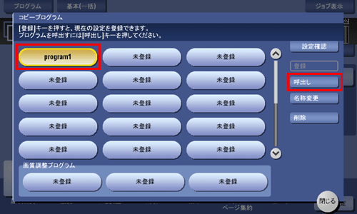 [登録サイズ]から呼出す用紙サイズを選び、[呼出し]をタップします。