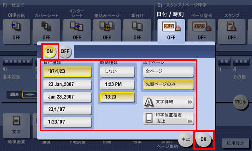 [ON]をタップして、[日付種類]、[時刻種類]、[印字ページ]を設定し、[OK]をタップします。