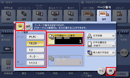 [ON]をタップして、[ページ種類]、[印字開始ページ番号]を設定し、[OK]をタップします。