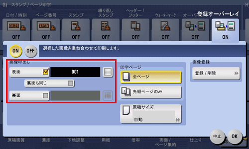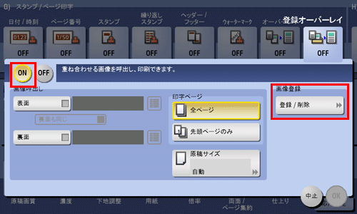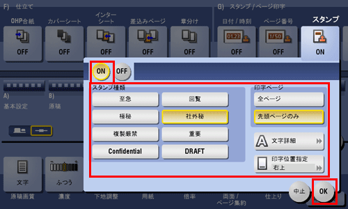 [ON]をタップして、[スタンプ種類]、[印字ページ]を設定し、[OK]をタップします。