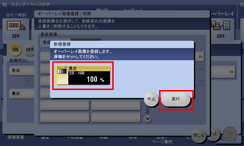 オーバーレイ画像として登録する原稿をセットし、必要に応じて[濃度]を設定して、[実行]をタップします。