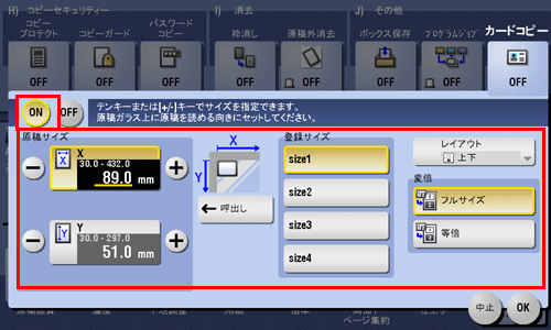 [原稿サイズ] | コピーするカードのサイズを入力します。[登録サイズ]から、あらかじめ登録されているサイズを呼出すこともできます。 | |