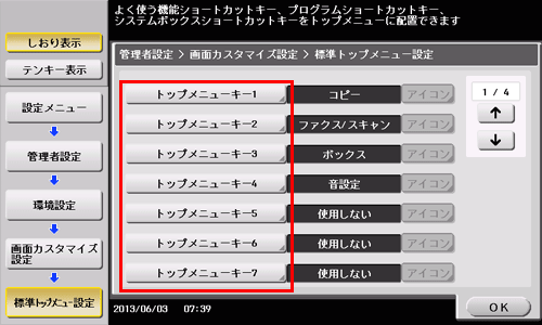 [環境設定]-[画面カスタマイズ設定]-[標準トップメニュー設定]を選びます。