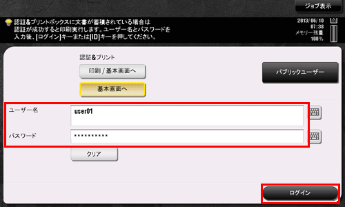 本機で登録されている[ユーザー名]と[パスワード]を入力し、[ログイン]をタップします。ユーザー認証が成功すると、本機を操作できます。