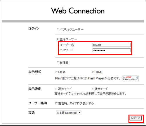 本機で登録されている[ユーザー名]と[パスワード]を入力し、[ログイン]をクリックします。ユーザー認証が成功すると、Web Connectionを操作できます。