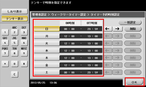 ウィークリータイマーを設定する曜日を選び、ON時刻とOFF時刻をテンキーで入力して、[OK]をタップします。