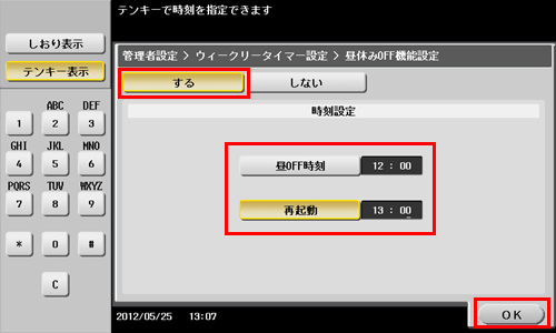 [する]を選び、節電モードに切換える時間帯をテンキーで入力して、[OK]をタップします。