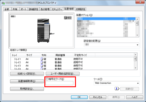 OpenAPIを介した通信をSSLで暗号化し、プリンタードライバーからの装置情報の自動取得ができる状態であれば、暗号化ワードを本機から取得できます。OpenAPIを介した通信をSSLで暗号化する方法について詳しくは、こちらをごらんください。