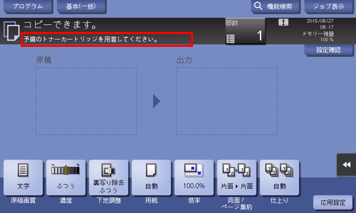 トナーカートリッジの交換時期が近づくと、交換時期が近づいていることをお知らせするメッセージが表示されます。保守契約に従って、交換用のトナーカートリッジを用意してください。