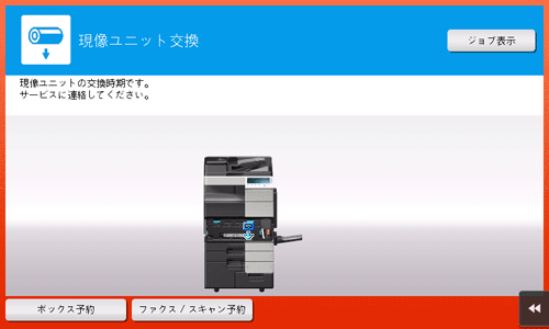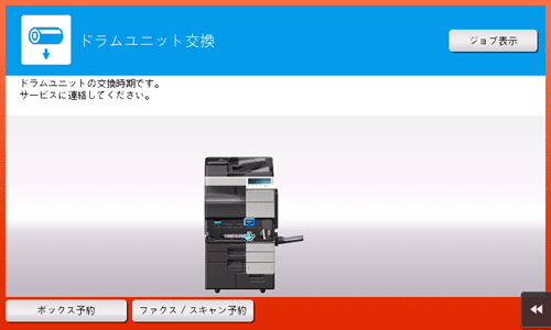 ドラムユニットが交換時期に達すると、サービス実施店へ連絡するようメッセージが表示されます。メッセージが表示されたら、サービス実施店にご連絡ください。