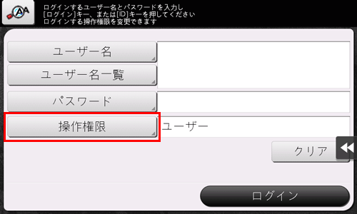登録ユーザーに管理者権限やボックス管理者権限が付与されている場合は、操作権限を選択してログインできます。本機の認証設定によって、ログイン画面の表示が異なることがあります。