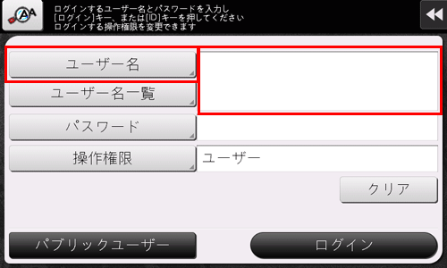 ユーザー名とパスワードを入力し、ユーザー認証を実施します。本機の認証設定によって、ログイン画面の表示が異なることがあります。