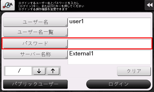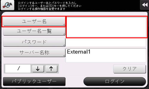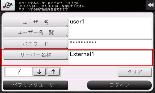 ユーザー名とパスワードを入力し、認証を実施するサーバーを選びます。本機の認証設定によって、ログイン画面の表示が異なることがあります。