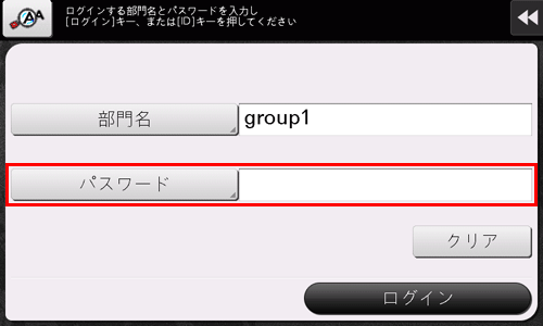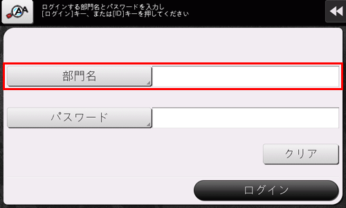 部門名とパスワードを入力し、部門認証を実施します。本機の認証設定によって、ログイン画面の表示が異なることがあります。