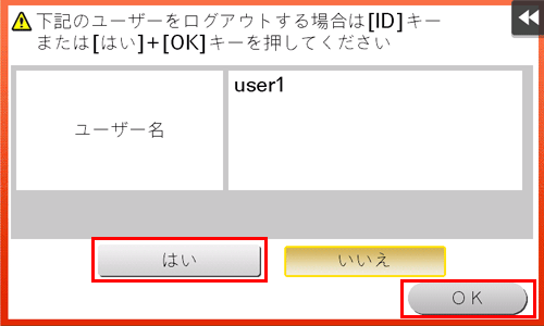ログイン画面で、ユーザー/部門の名前とパスワードを入力し、[ログイン]をタップするか、またはIDを押すと、認証を実施します。目的の操作が終わったらIDを押し、ログアウトします。